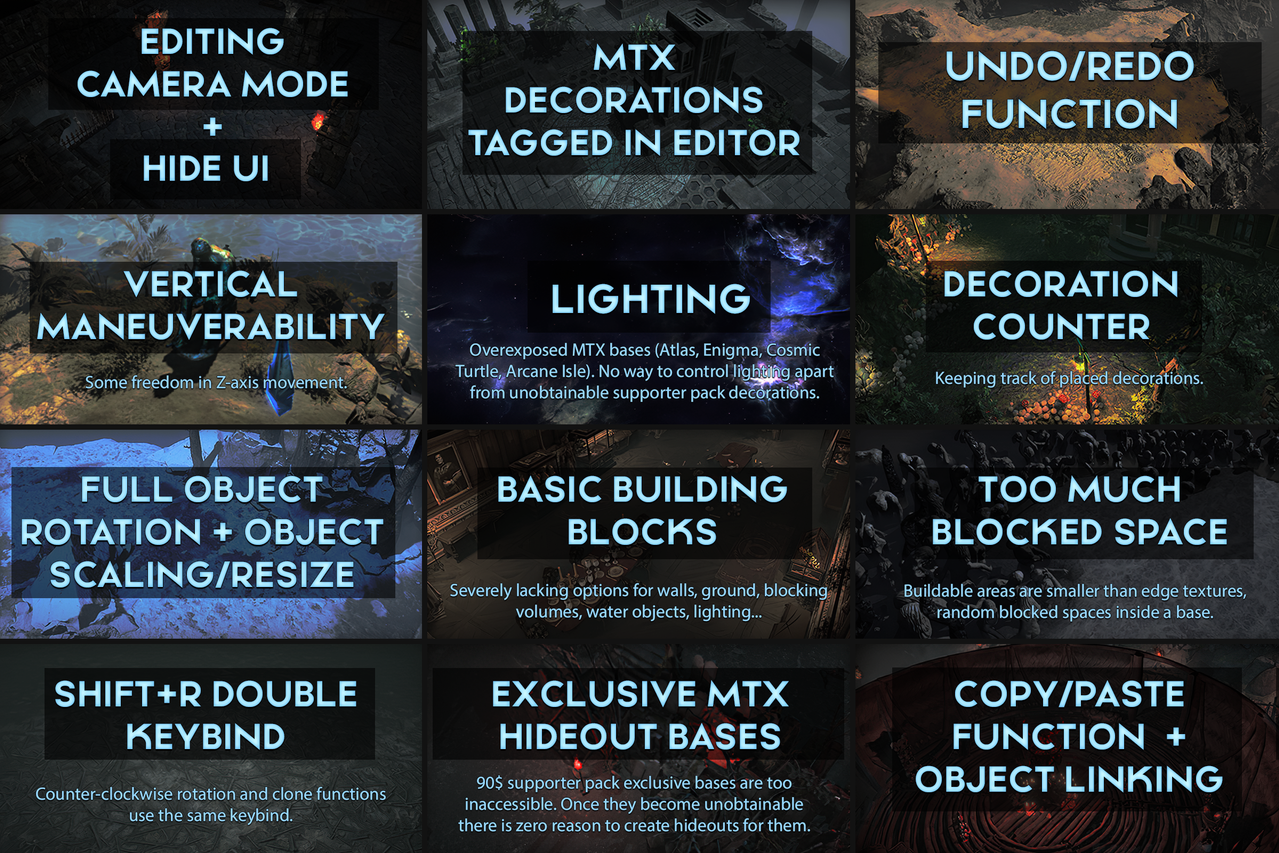 I fully agree with every idea shared here until now and most of them after. So far I really appreciate changes done to hideouts like the unified hideout system back then, the removal of favor and adding new bases and decorations from time to time. However, I still think the hideout community deserves more attention as I think making hideouts is one of the most fun parts of this game and even for some; the only endgame.