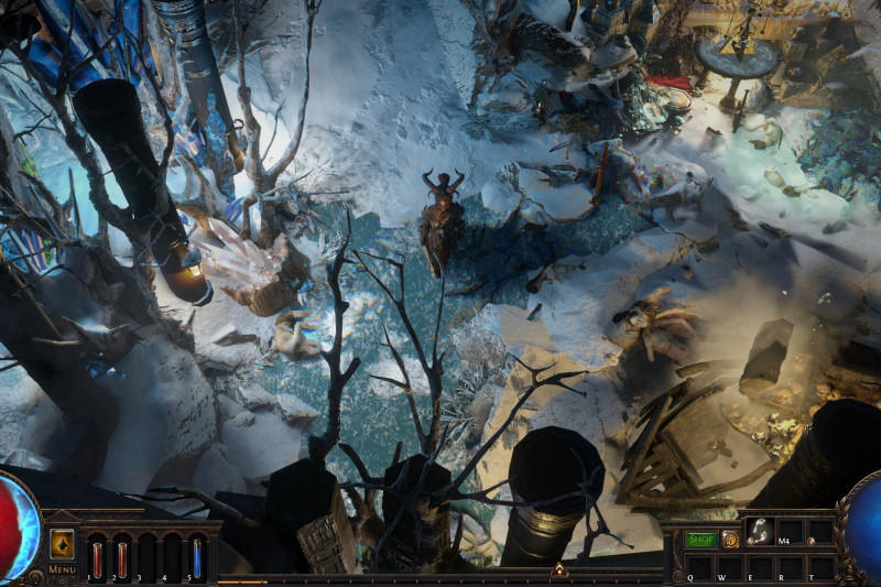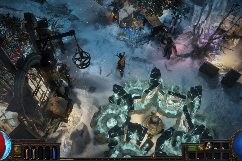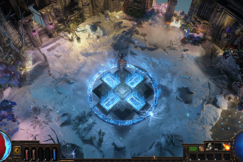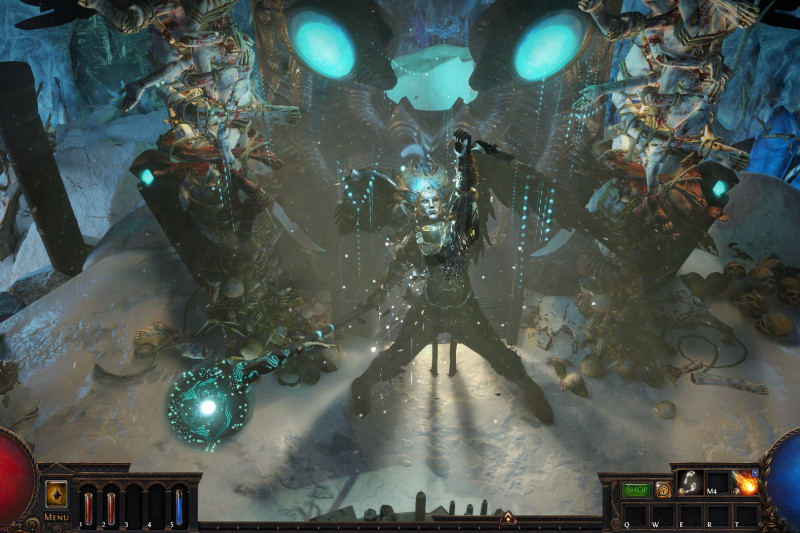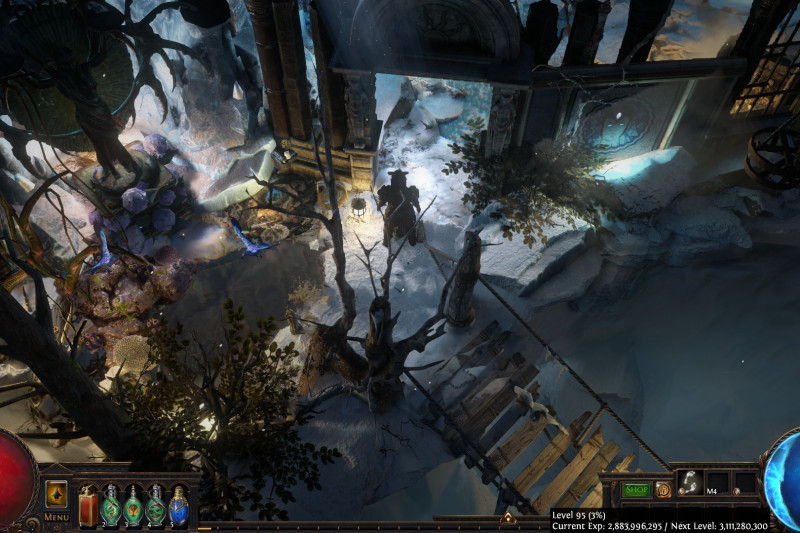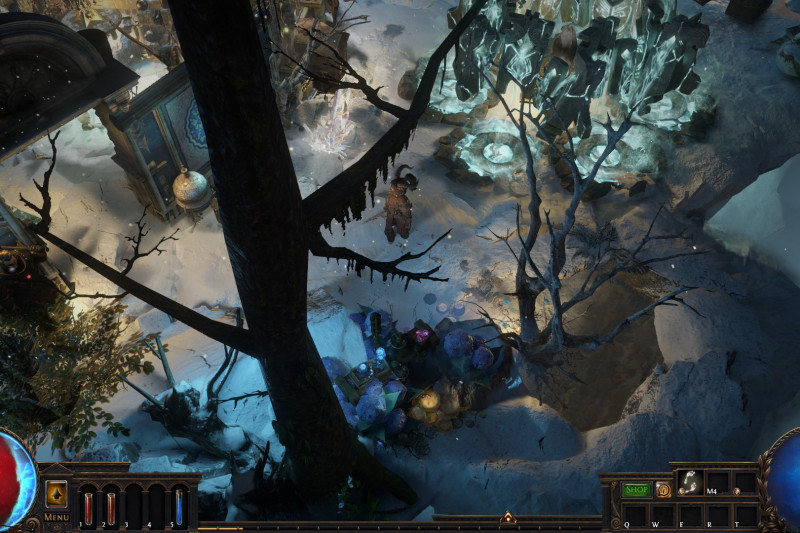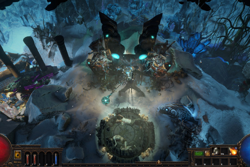 This hideout features polar and lunar elements with the temple fashioned into the shape of a waxing moon. Arohongui's two birds greet you after crossing the bridge (predating the disastrous dinner party with Kitava). Glacial terrain is littered with corpses cut down by Ikiaho's silver comet. On the summit, the goddess herself calls upon Lunaris, channeling a moonbeam from above. Many exiles lay frozen or drowned in icy water; an untimely end for those who seek riches, power, and knowledge.