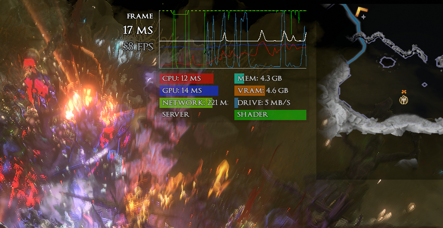 Ryzen 9 9950x3d w/5090 and shader cache size set to unlimited. Shader caches located on a 4TB PCIe 4.0 SSD. Network is dedicated fiber 1Gb up & down, usually less than 8-10ms in this game, and any other game. Especially prevalent in Mirage maps, after spawning a lot of monsters. The game just slows to a crawl when monsters spawn on the screen after doing things like opening a strongbox. Shader bar spikes, which causes network to spike. |