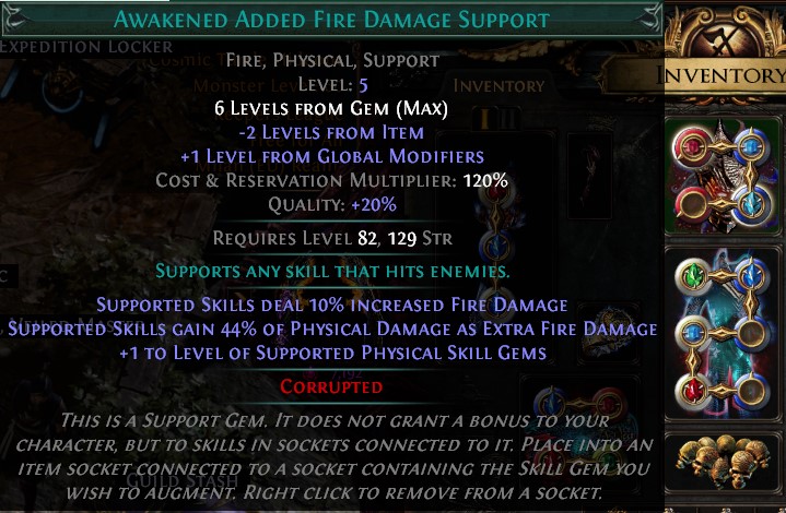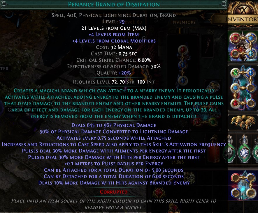 " (Assuming old screenshot since they have 2 wands now) +2 wand +2 amulet +2 aoe veiled mod +2 Archdemon +1 added from level 5 added phys Should be +9 total for Penance Brand, but the game is not recognizing the last modifier since it is downgraded from level 5 and raised back up, so only giving +8. Possibly related bug to how the game doesn't recognize having a level 10 Added X support states it gives +2, but gives +1. It's hard coded to having a level 5/6 and subtracting or adding to the support levels happens out of order. |