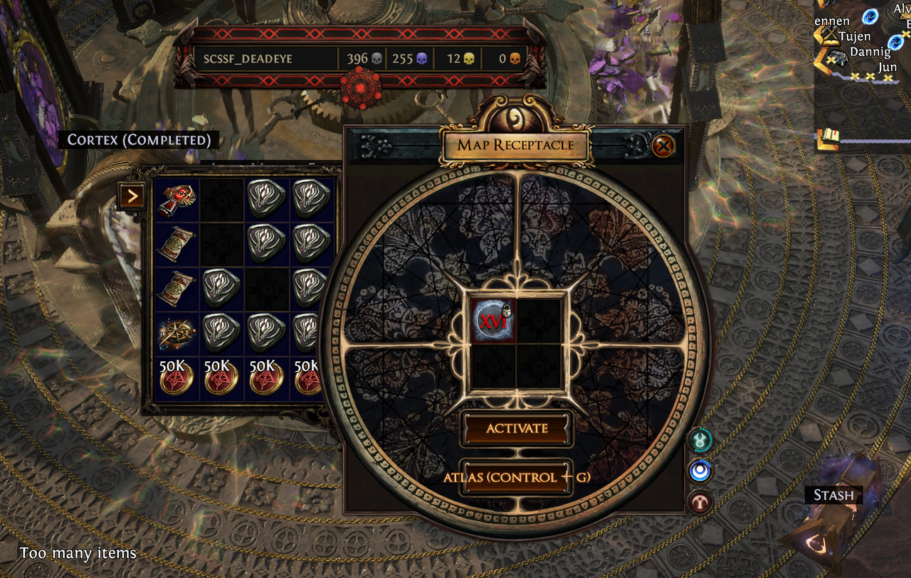 Bug report reference number: 283 375 923. How to reproduce, state : => SSF Standard after initial Mirage patch => Already completed all the old quests before the patch. => Atlas completed after running a t16 map (selected Port map for the first one) => I did not have any Eagon memory thread running before the friday mirage patch. => Run t16 Dunes maps => Click on Eagon thread that spawned in one of the maps => Spawn like this in the atlas ![]() But when I want to run this, the game doesn't want to open it and I am met with a "Too many items" error message. ![]() Please let us have a way to reset the state/fix that. Last edited by petroling#7491 on Mar 9, 2026, 4:48:14 AM