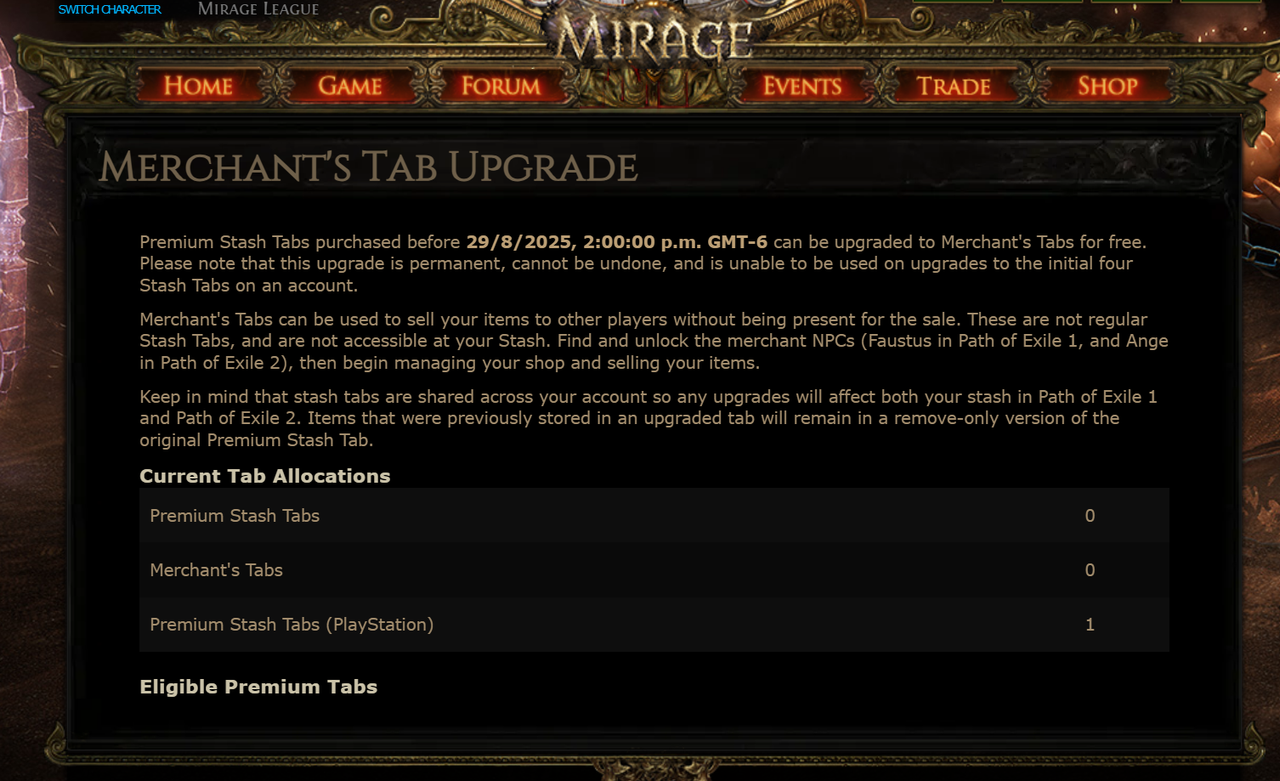 I wanted to upgrade my premium stash tab to a trader tab, but the option to do so isn't showing up. It's an initial stash tab that was upgraded to premium in 2024. I don't know if that affects anything. ![]() Last bumped on Mar 11, 2026, 6:18:03 PM