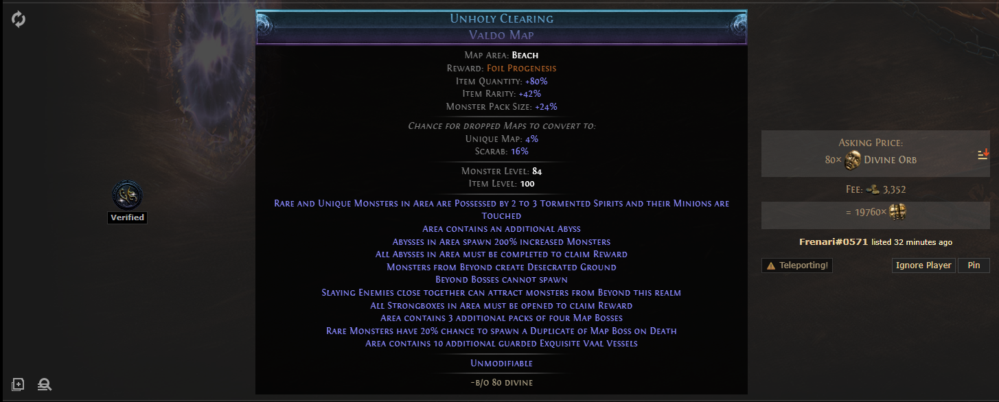 ![]() it deals damage to me, it can not be targeted nor damaged. It cannot self damage itself via bramblejack or thousand teeth temu. It cannot be converted by conversion trap and does not take damage via Righteous Fire or Fire trap or desecrated ground created by Lightbane Raiment. It can also not be targeted by minions such as Blink Arrow. It also is not visibly tight to the strongbox but the Vaal Vessel is still locked. For context this is Unholy Clearing Valdo Map Map Area: Beach for Progenesis ![]() ![]() PS: This is also the 2nd valdo map i "failed" due to it making itself uncompletable (first was bugged phased drox) Last edited by kingikingi#3741 on Mar 21, 2026, 12:12:43 PM Last bumped on Mar 21, 2026, 12:04:41 PM