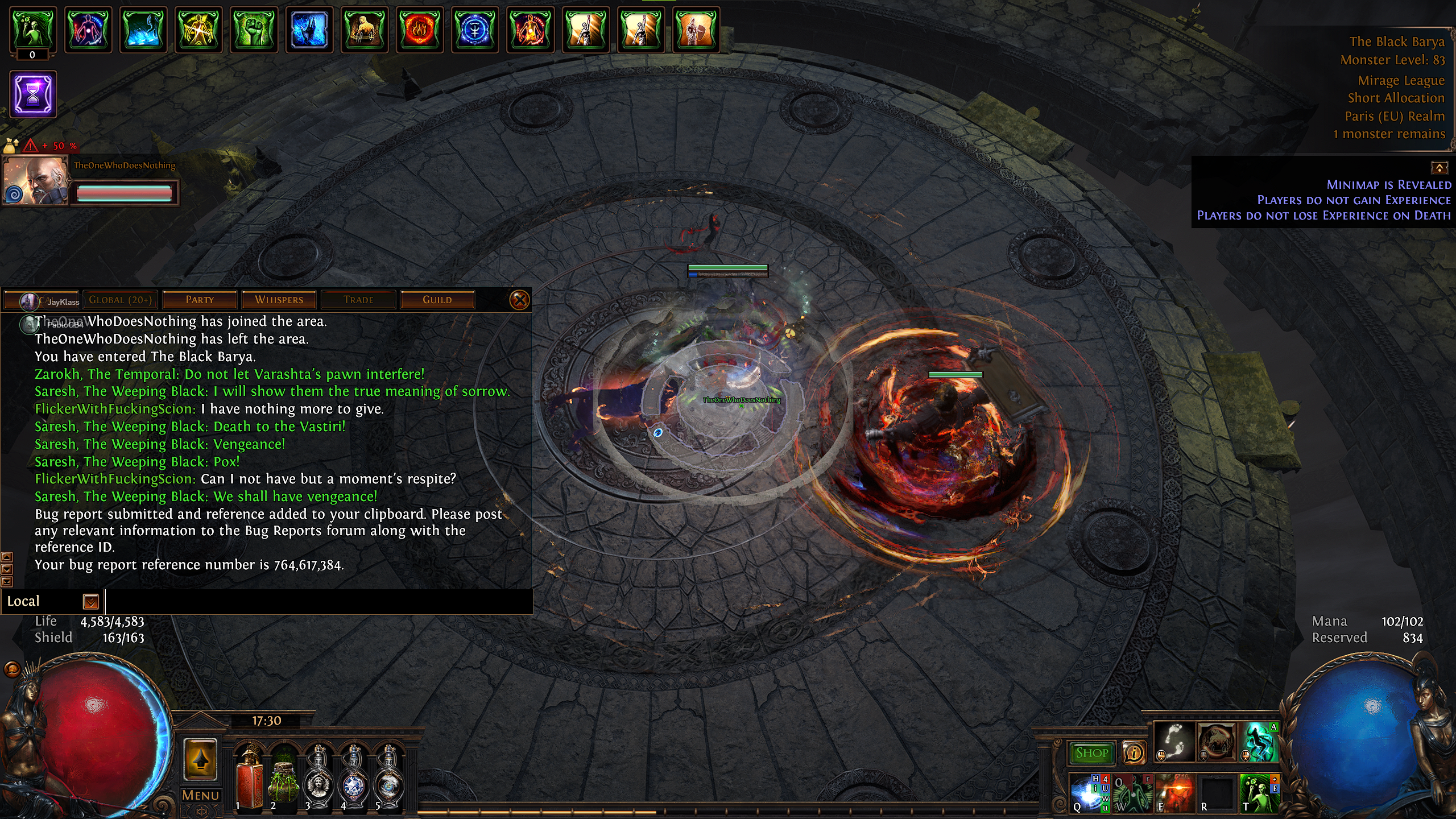 I was fighting the Black Barya boss with a teammate, and in the middle of the fight, the boss disappeared. It still shows that there’s an enemy in the arena and the boss music is playing, but it doesn’t reappear. ![]() Bug id: 764617384 Last edited by jayklass#4863 on Mar 26, 2026, 12:39:47 PM Last bumped on Mar 26, 2026, 12:35:51 PM